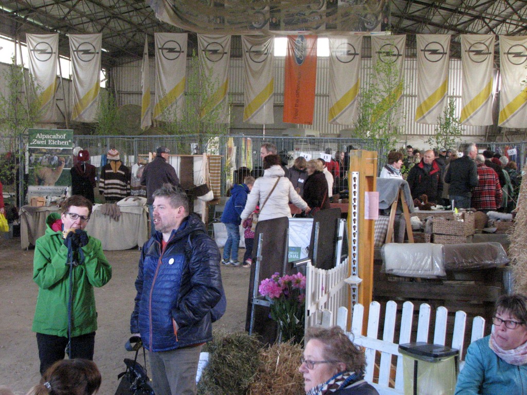 In verschiedenen farblichen Gruppen wurden die Hengste präsentiert. Zwischendurch gab es Informationen zur Haltung und Zucht, Herr Lothar Jander demonstrierte und referierte mit seinem Lamahengst Dario die Lamawanderung und machte Werbung für seine nächste große Tour. Frau Rühlich und Frau Reinhardt zeigten und erläuterten in einer Produktschau die verschiedenen Endprodukte aus der feinen Alpaka- und Lamafaser, die man an den Ständen der Züchter käuflich erwerben konnte.